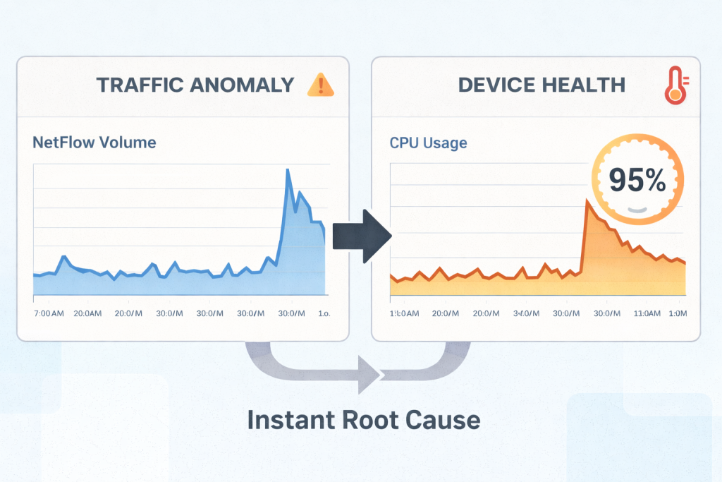 1. Differentiating Attacks from Failures: Instantly distinguish between a DDoS attack (High Flow + High CPU) and a hardware malfunction like a “broadcast storm” caused by a failing loop-prevention protocol.